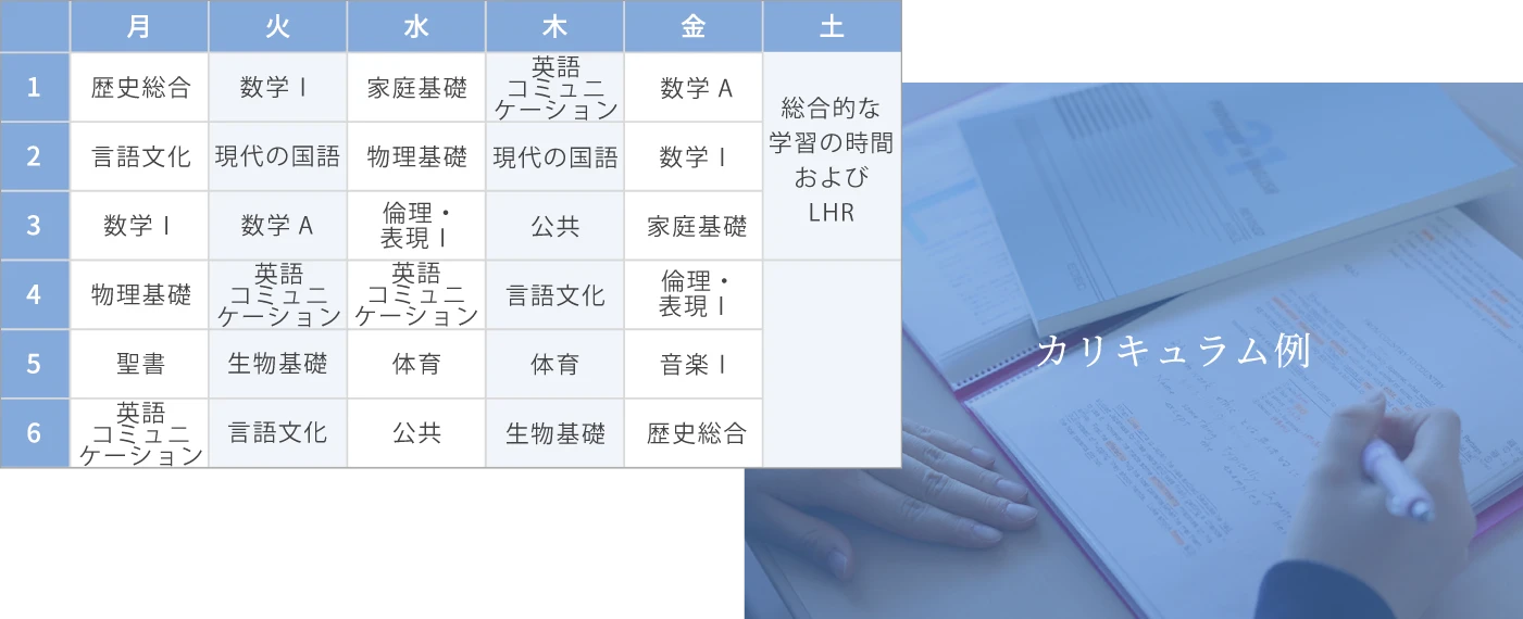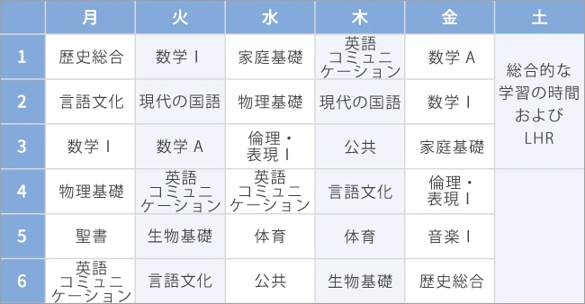 国語[4.5] 社会[3] 数学[4] 理科[4] 音楽[1.5] 美術[1] 保健体育[3] 技術・家庭[2] 外国語(英語)[6] 聖書・倫理[1] L・H・R[1] 総合的な学習の時間[2] |